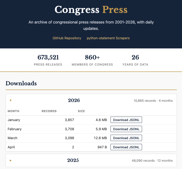 When I left ProPublica in 2021, we had lots of discussions about what should happen to the API. For a while it continued to chug along, but my updates to the scraping library were few and far between. But the interest from users didn’t really fade, so I’ve long thought about how to actually make the collection and distribution process work. ProPublica was kind enough to let me take some of the congressional data assets with me, and now I’m pleased to announce that I’ve got both a more robust scraping system and bulk downloads of all of the releases I’ve been able to collect over the years. I call it Congress Press.
