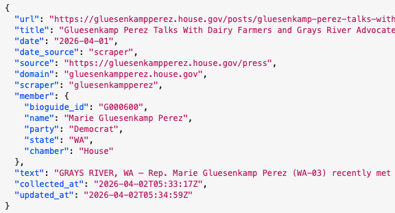 What makes this work are the regularly-updated list of current lawmakers from the United States Project on GitHub (which I contribute to) and Claude Code. There are many, many problematic uses of Large Language Models out there. Writing scrapers is not one of them. Of course, I’ve gotten better results on this project because I’ve written a lot of congressional press release scrapers before. So while I checked some of the code that Claude Code generated, I mostly checked the output, and I definitely found a few issues! But those issues were fixable. Both codebases are much better organized and more consistent than my usual programming habits would produce. It is still possible that some number of these scrapers have errors in some small way, although that dashboard would help me see those faster. But that’s a trade-off I’m willing to make in this case. It wouldn’t make the same decision in every instance.