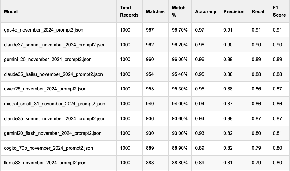 merged["committee_match"] = FalseBy converting the committee names entirely to lower case and calling strip() on them, I reduced the number of false negatives in my results. This had some visible results. For example, GPT-4o previously sat at a less-than-impressive 79.3 percent accuracy and now sits at a much more impressive 96.7 percent accuracy rate. This makes sense, given what I understood to be GPT-4o’s capabilities, and I should have caught this problem sooner.